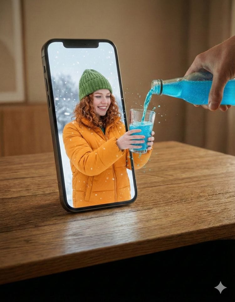 A hyper-realistic surreal photograph of a modern smartphone lying flat on a wooden table, its screen acting as a portal between two worlds. From inside the phone screen, a smiling young man dressed in winter clothing—puffer jacket, knit beanie, gloves—extends his hands outward into the real world, holding a clear glass. From outside the phone, a real human hand pours a bright neon-green carbonated drink into the glass, with liquid splashes frozen mid-air as it crosses the boundary between the digital screen and reality. Snowflakes drift inside the phone screen while the real environment remains warm and minimal. Ultra-detailed textures, cinematic lighting, shallow depth of field, photorealistic surrealism, high-resolution editorial photography.
